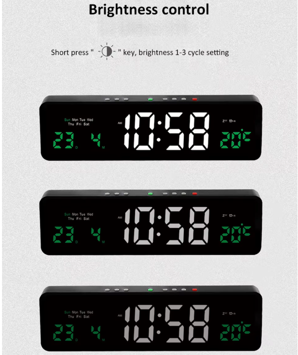 لراحتك التامة، توفر الساعة 3 مستويات سطوع قابلة للتعديل، مما يمنحك رؤية مثالية في النهار وليلاً بدون إزعاج. كما تدعم نظامي 12/24 ساعة لتناسب جميع التفضيلات.