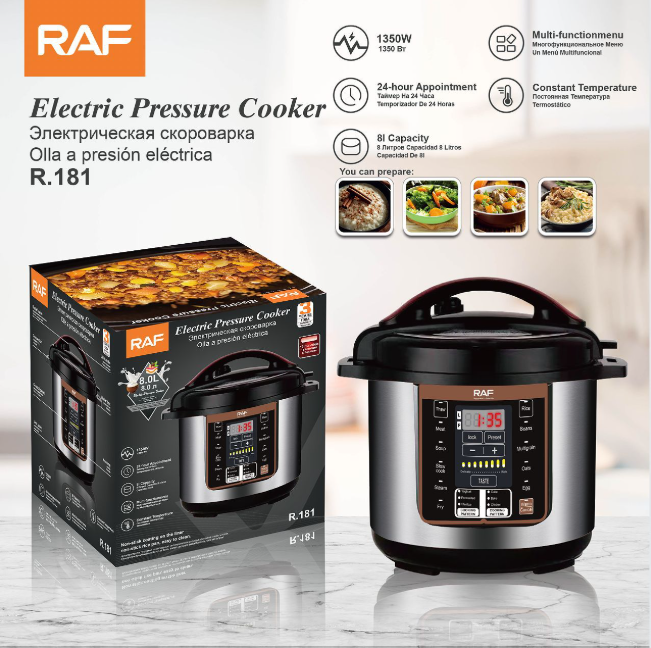 طنجرة الضغط الكهربائية RAF R.181 هي جهاز عصري مصمم ليوفر لك تجربة طهي أسرع وأسهل وأكثر أمانًا. بفضل قوتها العالية 1350 واط وسعتها الكبيرة 8 لترات، تمنحك القدرة على تحضير وجبات متنوعة لعائلتك أو لضيوفك في وقت قياسي مع الحفاظ على الطعم الشهي والقيمة الغذائية الكاملة للمكونات.