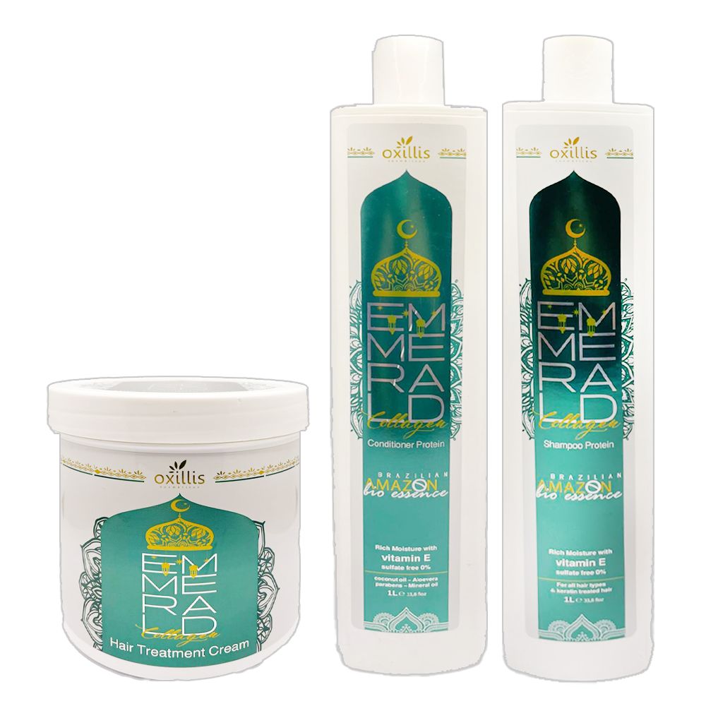مجموعة Oxillis Emerald Protein Therapy – شامبو بروتين 1 لتر + بلسم بروتين 1 لتر + ماسك علاجي مركز 900 غم