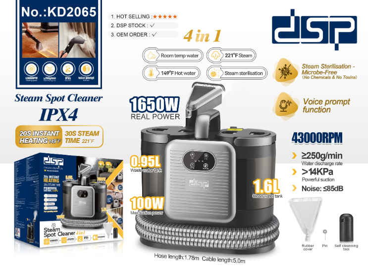 تمتع بنظافة شاملة ومعقمة مع جهاز DSP KD2065، المصمم للتعامل مع أصعب البقع والروائح. يعمل بقدرة 1650 واط ويولّد بخارًا فوريًا خلال 20 ثانية فقط. يوفر 4 وظائف في جهاز واحد: تنظيف بالماء العادي، ماء ساخن بدرجة 149°F، بخار بدرجة 221°F، وتعقيم بالبخار للقضاء على الجراثيم بنسبة 99.9%.
