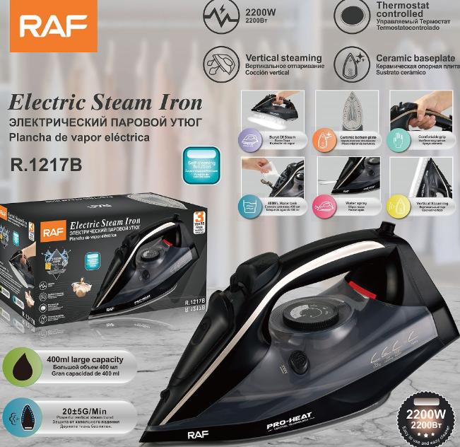 مكواة البخار الكهربائية RAF R.1217B تمنحك تجربة كي متكاملة تجمع بين القوة والراحة في جهاز واحد. بفضل القدرة الكهربائية العالية 2200 واط، ستتمكن من التخلص من أصعب التجاعيد بسرعة وفعالية، سواء على الملابس اليومية أو الأقمشة الثقيلة مثل الستائر والمفروشات.